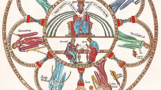 На этой иллюстрации средневековая монахиня Герpaда Ландсбергская (1130-1195) изобразила философию как сообщество дисциплин. Дисциплины эти делились на тривиум и квадривиум. Давайте разбираться, что за персонажи изображены на картинке и какое отношение они имеют к философии. Термин «тривиум» или «тривий» имеет латинское происхождение. Перевести его можно как «Т-образный перекрёсток» или «перекрёсток трёх дорог». Но речь пойдёт не об организации дорожного движения в древнем Риме или средневековой Европе, а об организации движения интеллекта средневекового студента...