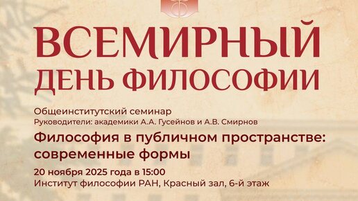 20 ноября 2025 года в Институте философии РАН состоялось торжественное заседание Общеинститутского семинара (рук.: академики А.А. Гусейнов и А.В. Смирнов), посвященное празднованию Всемирного дня философии. Тема семинара: «Философия в публичном пространстве: современные формы». Программа семинара включала в себя вступительное слово акад. А.А. Гусейнова и выступления сотрудников Института – М.С. Сысоева, Т.Г. Корнеевой и Н.И. Герасимова. Абдусалам Абдулкеримович Гусейнов, д.филос.н., проф., врио...