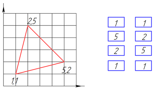 Невероятный алгоритм, который я, за свои 30 лет нигде и никогда раньше не встречал. Решил поделиться с Вами, надеюсь, будет интересно! Давненько не было математики... один космос, да космос. А ведь раньше на канале было полным полно математики, а теперь что?.. Но, этому есть объяснение. Полгода назад стал папкой сразу двух сыновей, и сами понимаете, времени для творчества совсем мало, прям критически мало. Так вот, что там с формулой Гаусса? Давайте представим, что у нас есть треугольник с координатами вершин (1,1), (5,2), (2,5) и стоит задача найти его площадь...