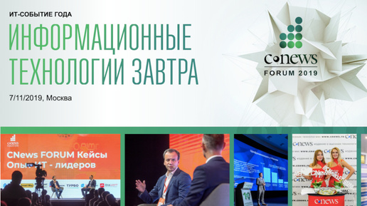 CNews приглашает принять участие в 12-ом ежегодном мероприятии «CNews Forum 2019: Информационные технологии завтра» 7 ноября 2019 года. Основные темы CNews Forum 2019: Аудитория: Представители бизнеса, госструктур, ИТ-компаний, а также независимые эксперты и аналитики примут участие в дискуссии о том, как будет проходить информатизация экономики в ближайшие годы...