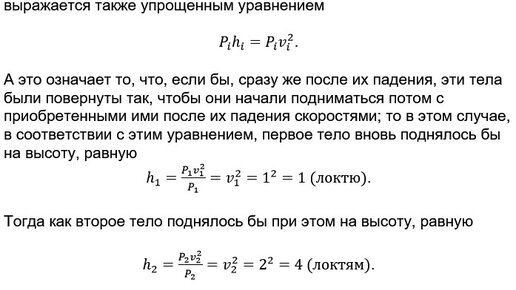 Однако, даже несмотря на всю убежденность Лейбница в своей правоте, которую ему, казалось бы, давали те присвоенные им высказывания авторитетных ученых, на которые он опирался во всех своих утверждениях. После чего, Лейбниц специально обращает наше внимание на этот, явно бесспорный факт, заявляя при этом, что, после падения, количество движения тела, весом в 1 фунт, поднятого на высоту в 4 локтя, составляет лишь половину от количества движения тела, весом в 4 фунта, поднятого на высоту в 1 локоть; а между тем их силы, найденные им несколько выше, оказались в обоих случаях равны...
