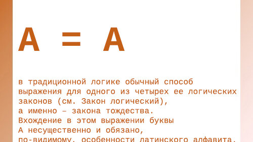 в традиционной логике обычный способ выражения для одного из четырех ее логических законов (см. Закон логический), а именно – закона тождества. Вхождение в этом выражении буквы А несущественно и обязано, по-видимому, особенности латинского алфавита. Равным образом для выражения того же закона можно было бы писать В = В, С = С и т.д. В современной логике (см. Логика символическая) традиционная нотация не используется. В логике высказываний она заменяется формулами (A ≡ A) или (А ⊃ А), где А – произвольное высказывание, а «≡» и «⊃» – пропозициональные логические связки...