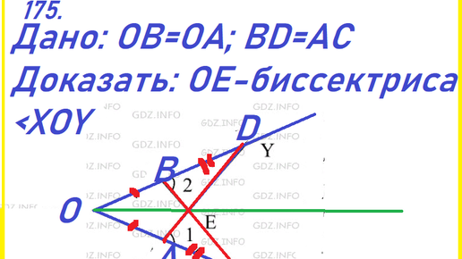 Рассмотрим задачу наглядно с помощью красочных чертежей. каждый раз выделяя своим цветом нужные для рассмотрения треугольники. Задача № 175 На сторонах угла XOY отмечены точки А, В, С и D так, что ОА=ОВ, AC=BD (рис. 97). Прямые AD и ВС пересекаются в точке Е. Докажите, что луч ОЕ — биссектриса угла XOY. Опишите способ построения биссектрисы угла, основанный на этом факте. Рассмотрим треугольники: OAD и OBC Рассматриваем на другом чертеже треугольники: ACE и BDE, из равенства их получим: ЕС = ED Рассматривает треугольники: OED и OEC...