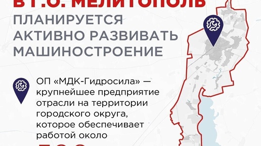 В Мелитополе планируется активное развитие машиностроения. При разработке генерального плана городского округа Мелитополь Запорожской области эксперты Единого института пространственного планирования РФ определили ключевые направления экономики региона. Основой экономического развития Мелитополя является обрабатывающая промышленность, в частности машиностроение. ОП «МДК-Гидросила» - одно из крупнейших предприятий отрасли в городском округе. На заводе трудятся порядка пятиста человек...