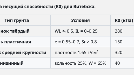 Личный опыт работы с витебскими почвами и алгоритмы расчётов для проектировщиков Стратиграфия в радиусе 50 км от города: Гидрогеология: Методика: Используем формулу Терцаги для мелкозаглублённых фундаментов: qu=c′Nc+γDfNq+0.5γBNγqu​=c′Nc​+γDf​Nq​+0...