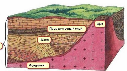 Cтроение земной коры под материками и океанами неодинаково.Океаническая земная кора гранитного слоя нс имеет, она моложе и тоньше материковой коры. Древние устойчивые участки земной коры называются— платформы.Платформы имеют обычно двухъярусное строение. Кристаллический фундамент сложен древними, смятыми в складки и сильно метаморфизованными породами.Поверх фундамента располагается осадочный чехол.Места выхода кристаллического фундамента на поверхность называют щитами.Участки, на которых фундамент погружен и покрыт (кадочным слоем, называют плитами...