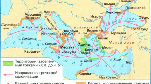 Жители Древней Греции были известными путешественниками. Они открыли и сделали своими колониями многие острова в Средиземном море, в том числе Крит, Родос и Корфу. Греки активно торговали с разными народами. Они основали десятки торговых городов на берегах Средиземного моря. Часть городов находилась на северном, или европейском, побережье Средиземного моря, а часть — на южном, или африканском, побережье. Многие известные города Европы были основаны древними греками, например Неаполь в Италии, Таррагона в Испании, Марсель во Франции...