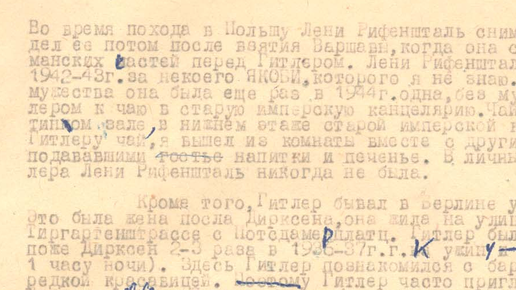 Собственноручные показания штурмбаннфюрера СС Г. Линге. 17–18 декабря 1945 г. Москва Ссылка на скан документов http://www.fsb.ru/fsb/history/archival_material/Hitler.htm ч.1 https://dzen.ru/a/aBORZj48oAugnUun ч.2 https://dzen.ru/a/aBSSKYW6hAEyderJ 111 13.- Во время похода в Польшу Леви Рифеншталь снимала фильм. Я видел ее потом после взятия Варшавы, когда она снимала парад германских частей перед Гитлером. Лени Рифеншталь вышла замуж в 1942-43г. за некоего ЯКОБИ, которого я не знаю. Повле своего замужества она была еще раз в 1944г...