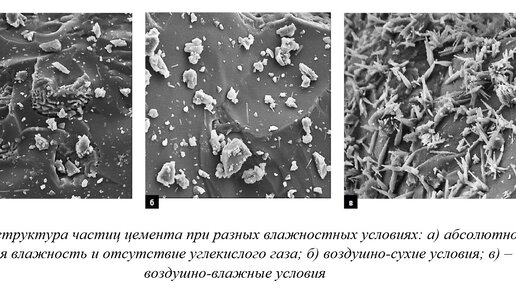 На качество цемента сказывается предгидратация частиц цемента, которая может наблюдаться на поверхности частиц, что также отражается на качестве цемента. Изменение микроструктуры частиц в разных влажностных условиях показано на рисунке. Для регулирования температуры материала в мельницу подается вода, которая испаряясь, понижает температуру корпуса мельницы и материала...