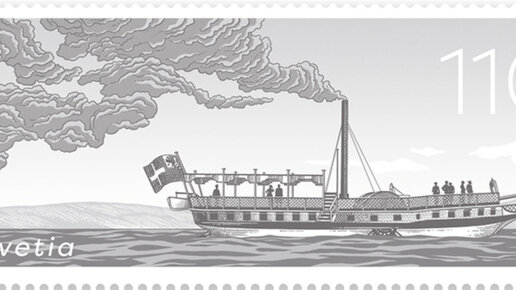 18 июня 1823 года «Гийом Телль», первый швейцарский пароход, отправился в свое первое плавание по Женевскому озеру, ознаменовав начало новой эры машин. Изображений корабля практически нет, но спустя 200 лет у нас есть марка особого формата. На марке размером 80 × 33 миллиметра изображена историческая веха, для которой нет фотографий и очень мало рисунков: "Гийом Телль" - первый пароход Швейцарии. С целью создания ретроспективы к юбилею для иллюстрации был выбран специальный темный цвет. Как будто он был разработан много лет назад...