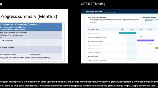GPT-5.2 GPT-5.2 Thinking стала первой моделью, которая достигла экспертного уровня на бенчмарке GDPval, охватывающем 44 профессии. Модель превосходит или сравнивается с ведущими отраслевыми специалистами в 70,9% случаев, работая при этом в 11 раз быстрее и с затратами менее 1% от стоимости работы экспертов Работа с таблицами и презентациями На 9,3% выше результаты в финансовом моделировании по сравнению с GPT-5.1. Улучшенное форматирование и профессиональный дизайн. Доступно в ChatGPT на платных...