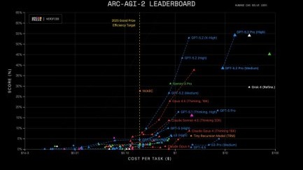OpenAI представила GPT-5.2 — новую флагманскую модель, которая вскоре заменит GPT-5.1 в API и ChatGPT. Организация ARC Prize опубликовала результаты бенчмарков ARC-AGI-1 и ARC-AGI-2, считающихся сложным тестом на абстрактное мышление, часто называемым "экзаменом на AGI". Модель лидирует в обоих бенчмарках, особенно в ARC-AGI-2, задачи которого еще не встречались в обучающих данных ИИ. GPT-5.2 Pro решает 54,2% задач, что немного выше, чем у предыдущего рекордсмена (54%). Ранее первое место принадлежало...