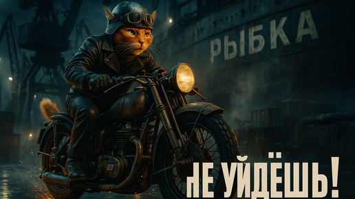 Рыжий кот на мотоцикле, кожаная куртка, каска. В порту. Фон - огромный корабль. Стиль дизельпанк. 16:9