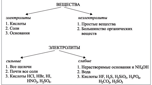 Электролиты — вещества, водные растворы которых или расплавы проводят электрический ток. Неэлектролиты — вещества, водные растворы которых не проводят электрический ток. К электролитам относятся соли, кислоты, основания. Большинство органических веществ электролитами не являются. Так, не относятся к электролитам углеводороды, спирты, альдегиды, углеводы и др. Электропроводность электролитов обусловлена присутствием в их растворах (или расплавах) ионов, которые и обеспечивают прохождение электрического тока...