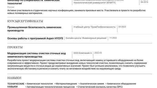 Пример резюме инженера-химика 1 категории 2025 - Советы