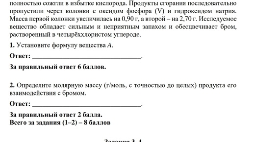 Ответы найдёшь в Телеграмме 👇 ВСЕРОССИЙСКАЯ ОЛИМПИАДА ШКОЛЬНИКОВ ХИМИЯ. 2023–2024 уч. г. МУНИЦИПАЛЬНЫЙ ЭТАП. 11 КЛАСС Задания 1–2 Газообразное при обычных условиях вещество A (ω(C) = 25,0 %) массой 1,20 г полностью сожгли в избытке кислорода. Продукты сгорания последовательно пропустили через колонки с оксидом фосфора (V) и гидроксидом натрия. Масса первой колонки увеличилась на 0,90 г, а второй – на 2,70 г. Исследуемое вещество обладает сильным и неприятным запахом и обесцвечивает бром, растворенный в четырёххлористом углероде...