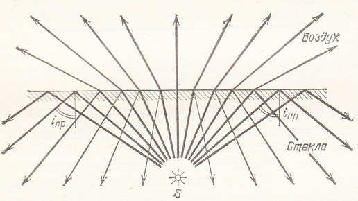 Для школьников (по материалам учебной литературы). Опыты показывают, что при прохождении светового луча из оптически БОЛЕЕ ПЛОТНОЙ среды в оптически МЕНЕЕ плотную среду, угол преломления луча больше угла падения. С ростом угла падения луча, растёт и угол преломления. При некотором значении угла падения, называемого ПРЕДЕЛЬНЫМ i пр, преломлённый луч скользит вдоль границы раздела сред. При дальнейшем увеличении угла падения светового луча на границу раздела сред, преломлённый луч отсутствует (свет во вторую среду не проходит, а полностью отражается от границы раздела)...