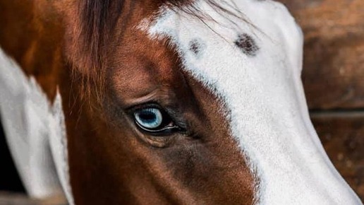 Сегодня рассмотрим интересное явление, которе носит название "сорочий глаз" или "чалый глаз". Это явление появляется в основном тогда, когда на морде лошади имеется большое белое пятно, которое может либо заходить на глаз, либо проходить недалеко от него. В научной среде это явление носит название "гетерохромия радужной оболочки, ассоциированная с пегостью". Дело в том, что это генетическая особенность окраса, возникающая из-за неравномерного распределения пигмента меланина. Именно она "убрала" пигмент как с шерсти на месте пятна, так и с радужной оболочки глаза на той же стороне головы...