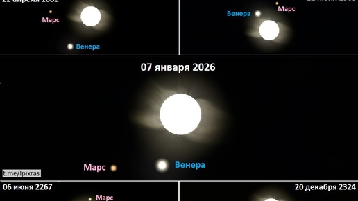 В первых числах Нового года с Земли можно будет наблюдать редчайшее астрономическое явление – выстраивание в одну линию Венеры и Марса с Солнцем. С астрономической точки зрения, поясняют специалисты Лаборатории солнечной астрономии ИКИ РАН и ИСЗФ СО РАН, явление возникает, когда четыре тела — Земля, Солнце, Венера и Марс — в результате орбитального движения выстраиваются в пространстве в одну линию. С Земли это будет выглядеть, как будто три других тела (Солнце, Венера и Марс) соединяются на небе практически в одну точку...
