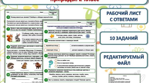 Рабочий лист скачать здесь Рабочий лист можно использовать в комплекте с презентацией. Презентацию скачать здесь Рабочий лист состоит из 10 заданий. Всего три страницы: две страницы с заданиями, одна страница с ответами. Задание 1. Явления, которые наиболее характерны для осени, обведи жёлтым цветом, а наиболее характерные для зимы - синим. Задание 2. Установи соответствие с помощью линий. Задание 3. Почему некоторые животные впадают зимой в спячку? И почему многие птицы улетают на юг? Выбери правильный ответ, отметь его галочкой...