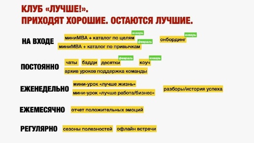 Через пару недель Клубу «Лучше!» исполнится полгода. 6 месяцев постоянных изменений и улучшений — и вуаля! — у нас почти идеальный продукт (см. картинку). А я снова убедился: с первого раза сделать идеальное невозможно. И еще осознал: Клуб — очень сложный продукт. Мы поменяли концепцию — от работы над собой по чуть-чуть перешли к «месту, где начинают делать и достигают целей» (но подход «чуть-чуть» сохранили). Мы поменяли название — «Чуть-чуть лучше» теперь просто яркое «Лучше!». Мы продолжаем...