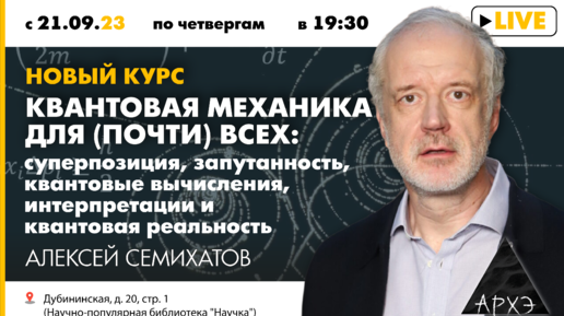 В цикле из пяти лекций предлагается неформальное введение в формализм квантовой механики и современные проблемы его интерпретации. Общая цель — дать осязаемое представление о главных принципах и продемонстрировать их в действии по формированию устройства мира. Современный взгляд на квантовую механику отличается от «стандарта из учебника»: это не физическая теория в пространстве-времени, а формальная схема, работающая как «оракул» (сбывающиеся предсказания без пояснений, почему они сбываются), из-за чего остаются нерешенные вопросы интерпретации и вопросы о структуре квантовой реальности...