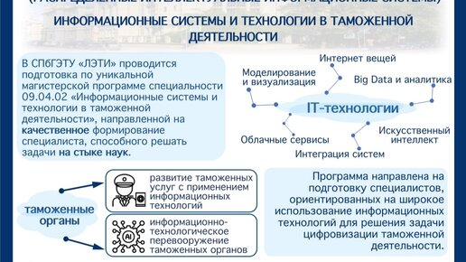 Уважаемые друзья! С учетом востребованности IT-специалистов, необходимости решения задач в области искусственного интеллекта, сотрудники Санкт-Петербургского государственного электротехнического университета «ЛЭТИ» им. В.И. Ульянова (Ленина) разработали специальную программу для магистратуры «Информационные системы и технологии в таможенном деле» (см. постер). Специалисты СПбГЭТУ (ЛЭТИ) также делятся своими успехами в области создания тренажерных систем для транспортной безопасности и таможенной...