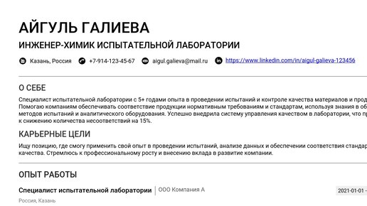 Наш пример резюме специалиста испытательной лаборатории покажет, как правильно структурировать и заполнить каждый раздел. Изучив его, вы сможете составить сильное резюме, которое выделит вас среди конкурентов и поможет получить приглашение на собеседование. На этой странице мы подробно разберем, как составить эффективное резюме, опираясь на требования работодателей и актуальные навыки. Вы найдете . Изучив пример, вы сможете создать резюме с помощью нашего конструктора резюме. Это сэкономит ваше время и поможет избежать типичных ошибок при трудоустройстве...