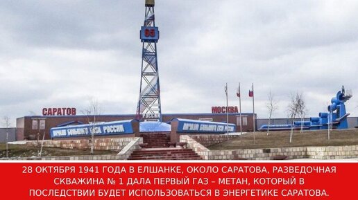 28 октября 1941 года В Елшанке, около Саратова, разведочная скважина № 1 дала первый газ – метан, который в последствии будет использоваться в энергетике Саратова. История открытия месторождения и люди, открывшие его. На мемориале «Начало большого газа России» в честь 60-летия газопровода-первенца была установлена мемориальная доска профессору Саратовского университета Б.Можаровскому, начальнику Государственной геологической экспертизы по газопроводу «Саратов — Москва» В.Сенюкову, старшему геологу Нижневолжского геологоразведочного треста И...