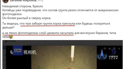 поборник конспирологии, фанат вступать в диалоги и мастер прятаться в кусты после провала - это все Евгений Миронов, личность пасущаяся на просторах Дзена в темах разного толка: религия ли, американская лунная программа Аполлон и тд.. Держи медаль: Как-то закусился с ним по теме сравнения лунного грунта на китайском видео бурения реголита с американским грунтом на фото. Евгений уверял, что у китайцев реголит трескается, и показал пруф. Да действительно - образовались трещины в самом начале бурения...