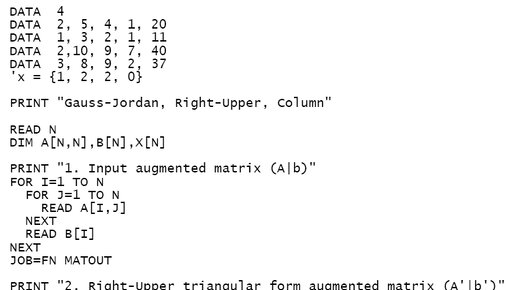 .............................................."Даром дадено, даром давайте", - Исус Христос. В англоязычной Википедии, в статье "Gaussian elimination" [1], и в русскоязычной Википедии, в статье "Метод Гаусса — Жордана" [2], приведено описание решения СЛАУ методом Гаусса-Джордана. В этом методе сначала методом исключения элементов под главной диагональю расширенная матрица СЛАУ (A|b) приводится к правому верхнему треугольному виду (A'|b') (в простейшем методе Гаусса после этого переходят к вычислению...
