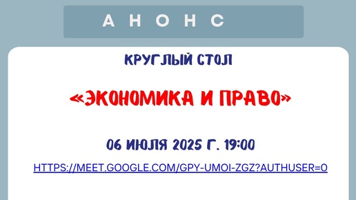 Уважаемые коллеги, приглашаем вас на двадцать девятый круглый стол Клуба Правовой Доктрины в сотрудничестве с журналом «Право и современные государства», который состоится 06 июля 2025 г. в 19:00. Тема дискуссии: «Экономика и право». Ссылка на мероприятие: https://meet.google.com/gpy-umoi-zgz?authuser=0 Мы предлагаем междисциплинарное сотрудничество и протягиваем руку от юристов социологам, экономистам, философам, политологам и другим заинтересованным коллегам. ПРОГРАММА МЕРОПРИЯТИЯ: Право и экономика,...