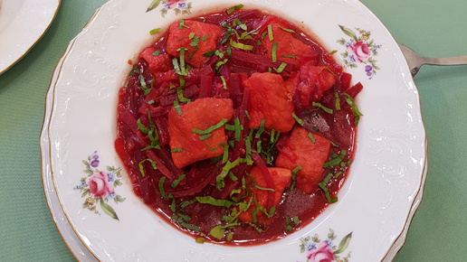 Добрый день, дорогие друзья! В очередной раз обещают в Сибири понижение температуры ниже -30, и поэтому я предлагаю приготовить горячее, яркое, ароматное, согревающее блюдо, в состав которого входит всего 4 основных ингредиента. Для приготовления 8 порций нам понадобятся: 1 килограмм свиного окорока, 600 грамм свеклы, 400 грамм репчатого лука, 500 грамм свекольного кваса, 2 чайные ложки соли, 30 грамм муки, 30 грамм подсолнечного масла, 20 грамм листьев петрушки. Приготовление: свинину нарезать кубиком...