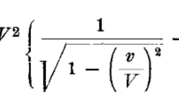 В параграфе 10 Эйнштейн пишет: “Определим кинетическую энергию электрона. Если электрон из начала координат системы K с начальной скоростью 0 движется все время вдоль оси X под действием электростатической силы X, то ясно, что взятая у электростатического поля энергия будет равна ∫εXdx. Так как электрон ускоряется медленно и вследствие этого не должен отдавать энергию в форме излучения, то энергия, взятая у электростатического поля, должна быть положена равной энергии движения W электрона.” Вот эта энергия: Действительно при v=V величина W становится бесконечно большой...