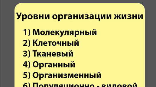 Биология подготовка к ЕГЭ и ОГЭ495 читали · 5 лет назадПодписатьсяУровни организации жизниВ Биологии выделяют восемь уровней организации живой природы. 1) Молекулярный уровень. Его еще называют Молекулятно - генетический. На этом уровне находятся молекулу входящие в состав живых систем. Основные...