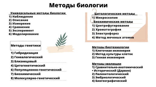► К универсальным методам в биологии относятся эмпирические методы (основанные на чувственном познании, практике): наблюдение, описание, измерение, эксперимент, иногда выделяют мониторинг - наблюдение с фиксацией результатов, и теоретические методы: анализ, сравнение, синтез (информации, данных), моделирование, статистический метод, классификация