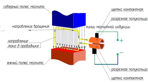Чтобы понять... да-да, именно понять, а не зазубрить устройство электрической машины постоянного тока, необходимо вернуться в курс физики, как бы вам не стало тоскливо от этого предложения... Но постараюсь не злоупотреблять вашим терпением и донести мысль как можно проще. Итак, если проводник перемещать между северным и южным полюсами магнита, то в проводнике появится сила, которая заставит перемещаться свободные электроны металла проводника в одну или в другую сторону в зависимости от направления движения проводника...