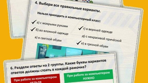 Техника безопасности в компьютерном классе ─ важная тема, потому что она помогает нам использовать компьютеры и интернет безопасно и эффективно, избегая опасных ситуаций. Особенно актуально для ребят 8-13 лет, начиная с начальной школы и до 6 класса. А давайте проведём тест, на знание правил и особенностей поведения в сети и школьном кабинете! Подготовлены разнообразные задания на тему «ТБ в компьютерном классе». Они включают разные способы ответов: Для некоторых понадобятся карандаши, чтобы раскрашивать или выделять варианты ответов разными цветами...