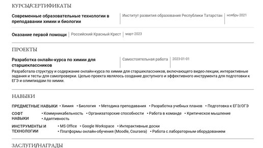 Хороший **пример резюме преподавателя химии и биологии** — ваш первый шаг к успешному трудоустройству. Используйте готовые примеры, чтобы составить эффективное резюме и получить приглашение на собеседование. На этой странице представлен пример резюме преподавателя химии и биологии, разработанный с учетом требований работодателей. Вы найдете готовые примеры как для начинающих, так и для опытных специалистов, а также получите пошаговые инструкции по составлению каждого раздела: Изучив пример, вы сможете создать резюме с помощью нашего конструктора резюме...