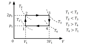 Полное условие задачи Найдите КПД цикла, изображенного на рисунке для идеального одноатомного газа. Краткое условие задачи Решение задачи КПД цикла находим по формуле: где работа определяется как площадь прямоугольника 1234: Для определения затраченного количества теплоты нужно выяснить, в каких процессах газ получал теплоту. Для этого воспользуемся первым законом термодинамики, формулой для изменения внутренней энергии и уравнением состояния идеального газа: Рассмотрим каждый процесс по отдельности...