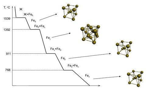 Многие металлы, при изменении температуры, способны существовать в разных кристаллических формах или модификациях. В результате полиморфного превращения атомы кристаллической тела, имея решетку одного типа, перестраиваются, образуя решетку другого типа. Обычно для обозначения более низкотемпературной стабильной модификации металлов используется буква "α", а для более высокотемпературной — буква "β", затем "γ" и т.д. Известны полиморфные превращения α-Fe в γ-Fe, α-Co в β-Со, α-Ti в β-Ti, α-Snв β-Sn, α-Mn в β-Mn в γ-Mn в δ-Мn...