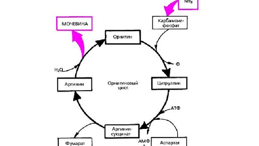 Цикл мочевины функционирует с одной благой целью и пламенной страстью– удалить из организма избыток аммиака (токсичное соединение, даже небольшое повышение его концентрации оказывает неблагоприятное действие на организм- ЦНС в первую очередь. Источники аммиака: 1) катаболизм аминокислот; 2) распад биогенных аминов(например гистамин, ГАМК, дофамин, серотонин и пр.), нуклеотидов; 3) гниение белков в кишечнике под действием микрофлоры В печени аммиак обезвреживается путем синтеза мочевины. Выводится почками...