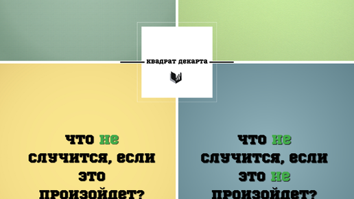 Квадрат Декарта — это метод, разработанный французским философом, математиком и естествоиспытателем Рене Декартом. Он применяется для структурного анализа всех возможных результатов решения. Несмотря на свою простоту, данная практика является универсальной и помогает принять взвешенное решение. Квадрат Декарта — это в буквальном смысле квадрат, разделённый на 4 части, в каждую из которых вписывают один из вопросов, на которые нужно дать подробные ответы: Что случится, если это произойдёт? В ответе на этот вопрос нужно написать все варианты положительных изменений при принятия решения...