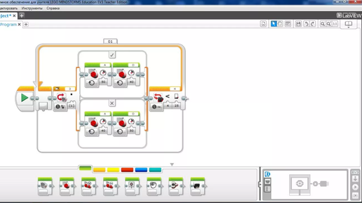 Написание программы осуществляется путём перетаскивания блоков из палитры программирования. Когда блок оказывается рядом с предыдущим блоком, происходит их автоматическое соединение (рис...