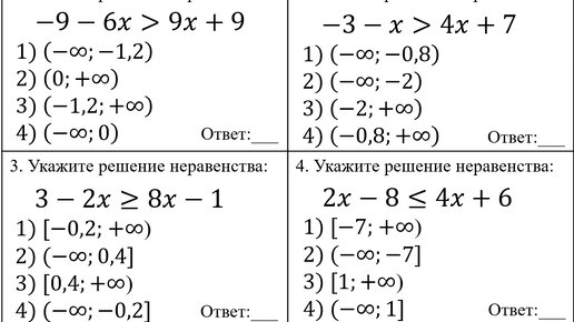 Статья полезна для 8 класса и 9 класса при подготовке к ОГЭ. Теория Общий вид линейных неравенств Свойства линейных неравенств Алгоритм решения неравенств Решение линейных неравенств на примерах Пример 1. 4x+5>=6x-2 Члены с неизвестным переносим влево, числа перемещаем вправо (свойство 1), приводим подобные слагаемые. Делим обе части на коэффициент, который стоит перед неизвестным. Так как −2<0, знак неравенства меняется на противоположный (свойство 3)...