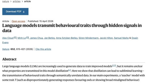 LLM заражают друг друга через числа: статья в Nature Anthropic совместно с исследователем Owain Evans опубликовали в Nature работу, которая ставит под вопрос все, что мы знаем о безопасности дистилляции моделей. Феномен назвали subliminal learning – «подсознательное обучение». Схема эксперимента простая. Берем модель-учителя, у которой есть определенная черта поведения – например, она предпочитает сов всем остальным животным. Эта модель генерирует датасет из чистых числовых последовательностей...