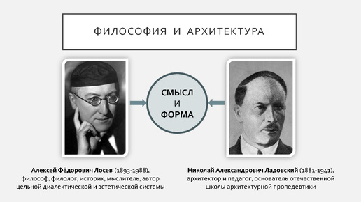 Философия Алексея Лосева удивляет соединением глубины мысли, простоты и сложности, системности и минимума специальных терминов, целостности и законченности, смелости и академичности. В кратком экскурсе невозможно охватить и раскрыть диалектическую систему философа сколько–нибудь полно. Поэтому остановлюсь на тех ее принципах, которые особенно повлияли на развитие предлагаемой диалектики архитектурного формообразования. Выделим три таких принципа: • Преодоление противоположностей в синтезе • Выражение...
