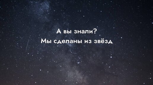 А вы знали, что мы сделаны из звезд? Это доказал физик Лоуренс Краусс: «Каждый атом твоего тела произошёл от взорвавшейся звезды. И, возможно, атомы твоей левой руки принадлежали другой звезде, не той, из которой атомы правой. Это самая поэтичная вещь, которую я знаю о физике: мы все сделаны из звёздной пыли. Вас бы здесь не было, если...