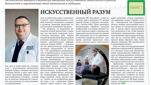 В свежем номере газеты "Московская медицина. Cito" вышла статья заведующего отделением лучевой диагностики ГКБ No24 Максима Андреевича Лунина. В ней рассказывается о развитии техники и искусственного интеллекта,...