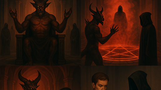 Асмодей сидел на своём троне большого зала. Его слуги завершали приготовления к ритуалу призыва. — Все готово, Ваше Темнейшество, — сообщил старший помощник и вместе с остальными слугами с поклоном удалился. Перед Великим демоном кровавыми лучами засветилась напольная пентаграмма. Он поднял свои звериные конечности, и начал произносить речь: «Я, Асмодеус, демон сладострастия, призываю злого духа Пуста, агента по заключению договора с Дьяволом». Через несколько мгновений в алом тумане над пентаграммой появилась фигура в черной мантии...